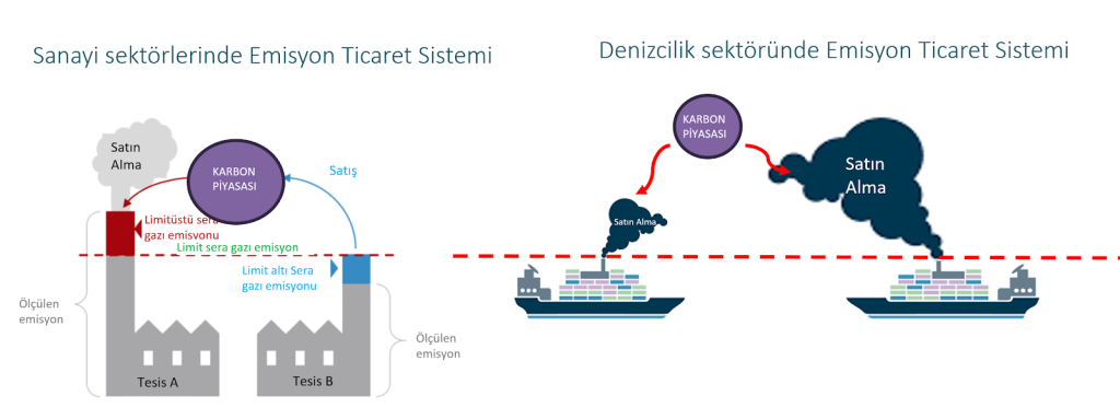 Temel yaklaşım olarak kirleten öder prensibi ortaya konmuş olup, gemilerin tüm sera gazları emisyonları için emisyon izni satın alınması gereklidir. 2005 yılından itibaren endüstri sektörlerine uygulanan sistemde diğer endüstri sektörlerinde bulunan ücretsiz emisyon izin tahsisatları denizciliğe uygulanmamış, doğrudan satın alma zorunluluğu getirilmiştir. Prensip olarak vergiden farkı, emisyon izin bedellerinin sabit fiyatlı olmaması ve mevcut Avrupa karbon piyasasında arz-talep dengesi içinde oluşan bedelden istendiği zamanda satın alınabilmesidir. Emisyon kapsamı gemi tankından sonraki emisyonlar olarak saptanmış olup, AB limanlarında ve AB limanlar arası % 100, AB dışındaki limanlardan AB limanlarına ve AB limanlarından AB dışı limanlara yapılan seferlerde % 50 emisyon kapsama dahildir.