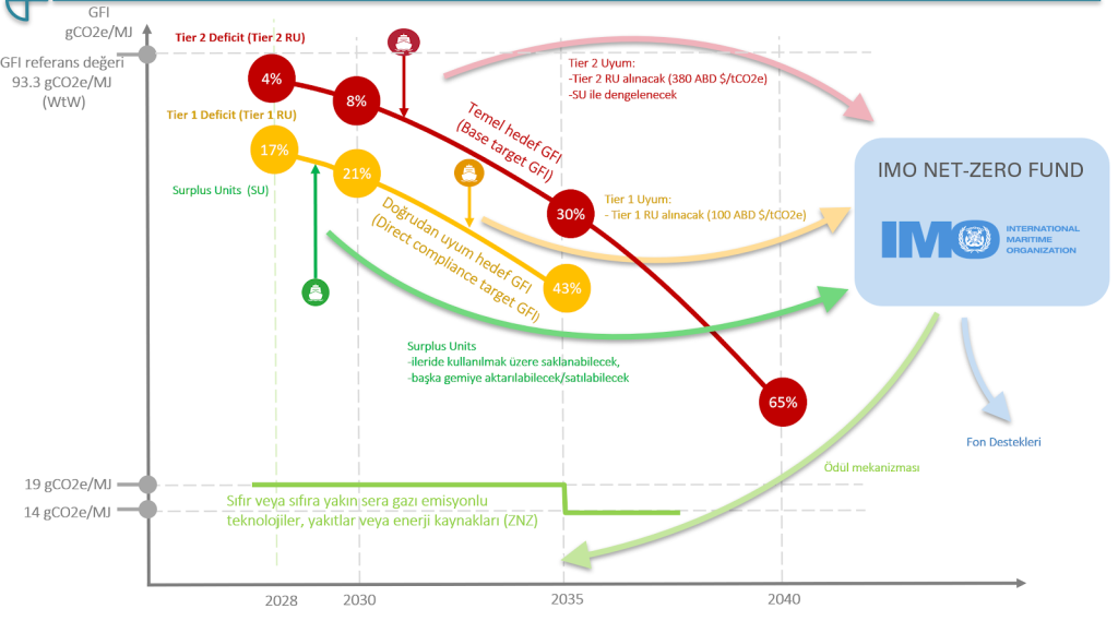 Küresel bir sera gazı fiyatlandırma mekanizması kurulması IMO da 2020’li yıllarda yeniden tartışılmaya başlamış ve 2025 Mayıs ayında düzenlenen MEPC 83 toplantısında Net Sıfır Çerçevesi (NZF: Net Zero Framework) kabul edilmiştir. IMO NZF temel olarak AB FuelEU Maritime benzeri bir kural olup, sera gazı yoğunluğuna göre temel hedef ve doğrudan uyum hedefleri belirlenmekte, temel hedef üzeri yüksek, doğrudan uyum hedefi ile temel hedef arası daha düşük fiyatlandırılmaktadır. IMO tarafından küresel planlanması dolayısı ile toplanacak fonların özellikle az gelişmiş ve gelişmekte olan ülkeler için kullanılması, ZNZ yakıt kullanan gemilerin ödüllendirilmesi hedeflenmektedir.