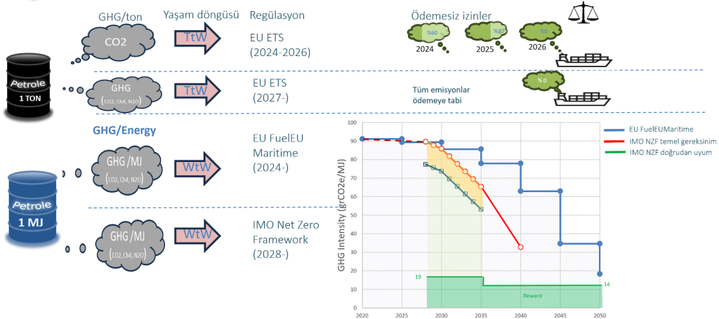 Günümüz deniz işletmeciliğinin en önemli konularından biri olan sera gazlarının azaltımı için küresel ve bölgesel teknik ve operasyonel tedbirler oluşturulmaktadır. Uluslararası Denizcilik Örgütü (IMO) tarafından çıkarılan gemilerin enerji verimliliği üzerine sınırlayıcı enerji verimliliği dizayn endeksi (EEDI ve EEXI), karbon yoğunluk göstergesi (CII), gemilerde enerji yönetimi (SEEMP) ve emisyon raporlaması (DCS) sektörün karşılaştığı zorluklara rağmen uyum gösterdiği regülasyonlar olarak görülmektedir. Ancak Avrupa Birliği tarafından 2024 yılı başında uygulamaya konulan Emisyon Ticaret Sistemine (ETS) denizciliğin dahil edilmesi ve denizcilikte yakıt değişimi (FuelEU Maritime) IMO kurallarından farklı olarak denizciliğe sera gazlarının azaltılmasında finansal boyutu da getirmiştir. Her ne kadar her iki regülasyon da finansal ödemeleri gerektirmekte olsa da temel olarak farklı hedefler taşımaktadır.