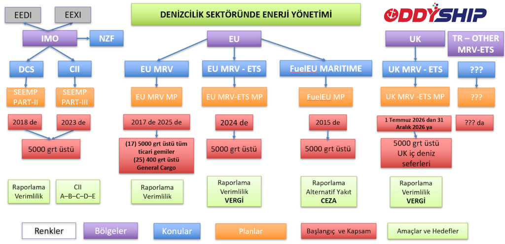 Yukarıdaki tablo, denizcilik sektöründe enerji yönetimi ile ilgili konuları, kuralları, uygulamaları ile bunların amaç ve hedeflerini bütüncül bir çerçevede özetleyen rehber niteliğinde bir görsel sunmaktadır.  Denizcilikte enerji ve karbon yönetimi; EEDI–EEXI (tasarım), DCS–CII (operasyon) ve EU MRV–EU ETS–FuelEU Maritime–IMO NZF (maliyet ve yaptırım) ekseninde bütüncül bir yapı hâline gelmiştir. 5.000 GT üzeri gemiler için raporlama ile başlayan yükümlülükler, bugün doğrudan operasyonel ve ticari kararları etkileyen bir sisteme dönüşmüştür.